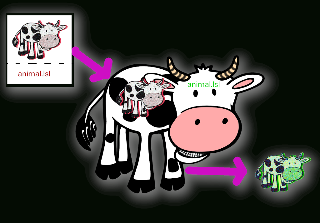 When you use the Rez box/HUD to get a new animal, the selected animal is rezed out of the object and a copy of the script called animal is placed in the new animal. The animals all contain a copy of themselves (without the animal script) so they can reproduce by doing the same as the rez box/HUD i.e. rez out the animal and send it their version of the animal script