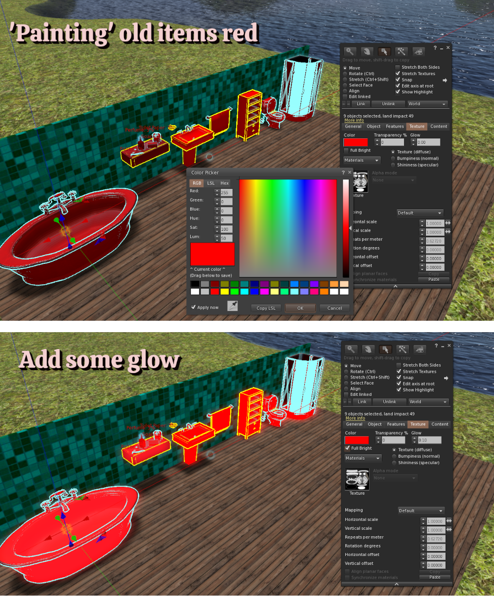 To ‘paint’ things, right click one item and select Edit, then you can ‘shift click’ on more items to select them as well. Next click on the Texturetab and here click on the Coloroption. Pick a nice bright red! You may also want to click on Full Brightand also set some Glowto help you see what are the old items.