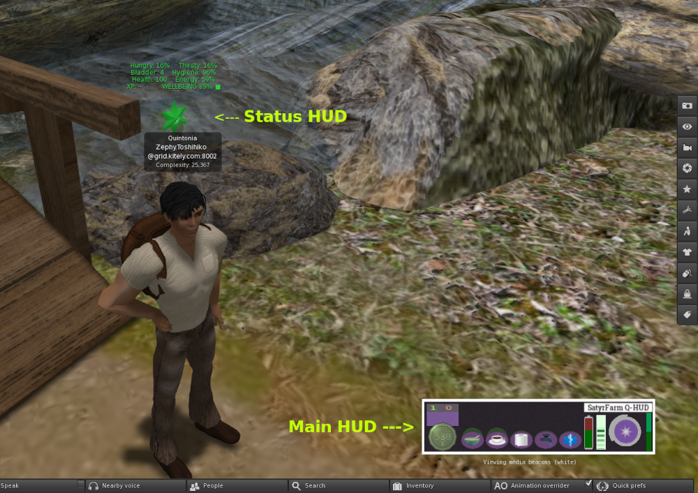 It consists of the main HUD that by default sits bottom right of your computer screen. It can only be seen and used by you. There is also an optional status HUD that you wear and it floats above your head where it can be seen by everyone.
